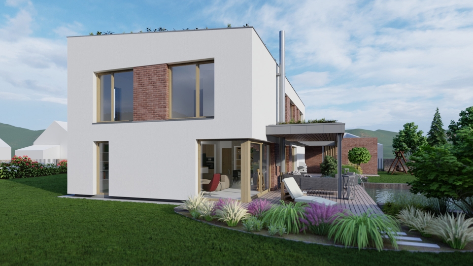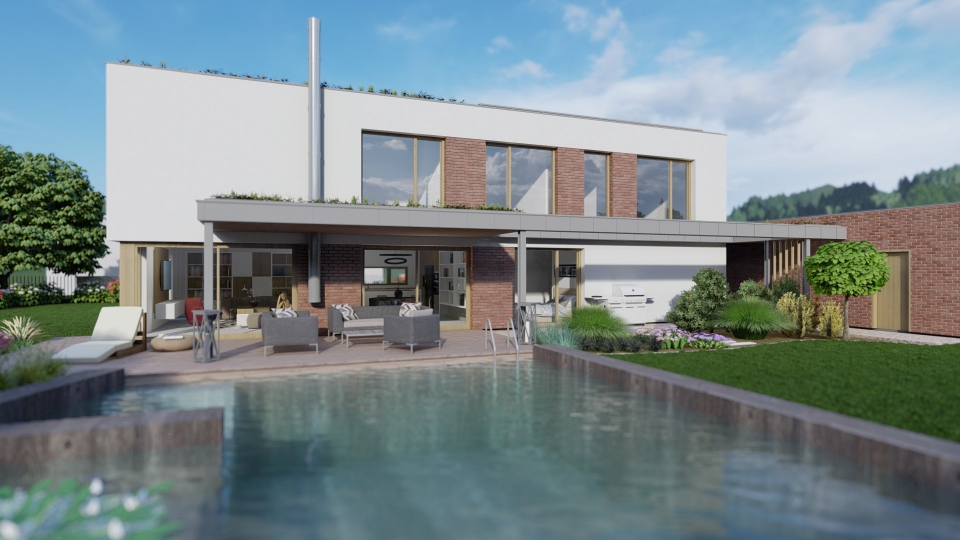 Dům s jezírkem je navržen jako klidné a harmonické rodinné bydlení, které v maximální míře využívá potenciál bezprostředního kontaktu s přírodou. Architektura stavby kombinuje jednoduché tvary s přírodními materiály, které podporují pocit útulnosti a propojení s okolním vodním prvkem. Jezírko a přilehlé venkovní prostory jsou plánovány jako integrální součást návrhu, vytvářející rozšíření obytného prostoru a místo pro relaxaci.