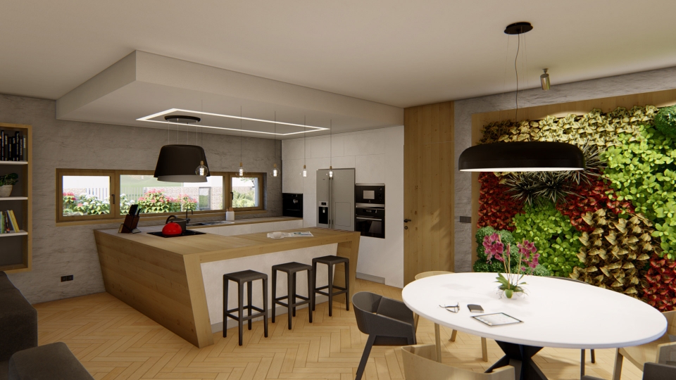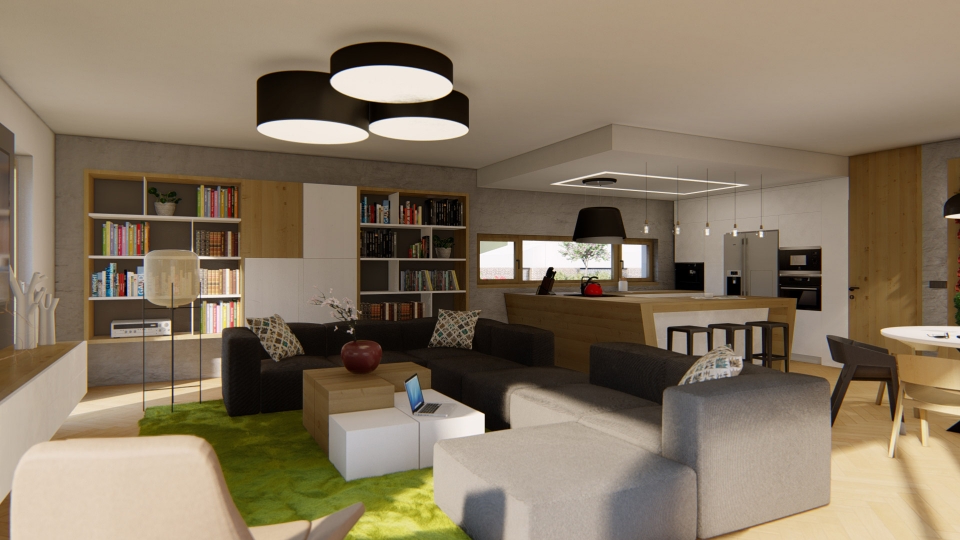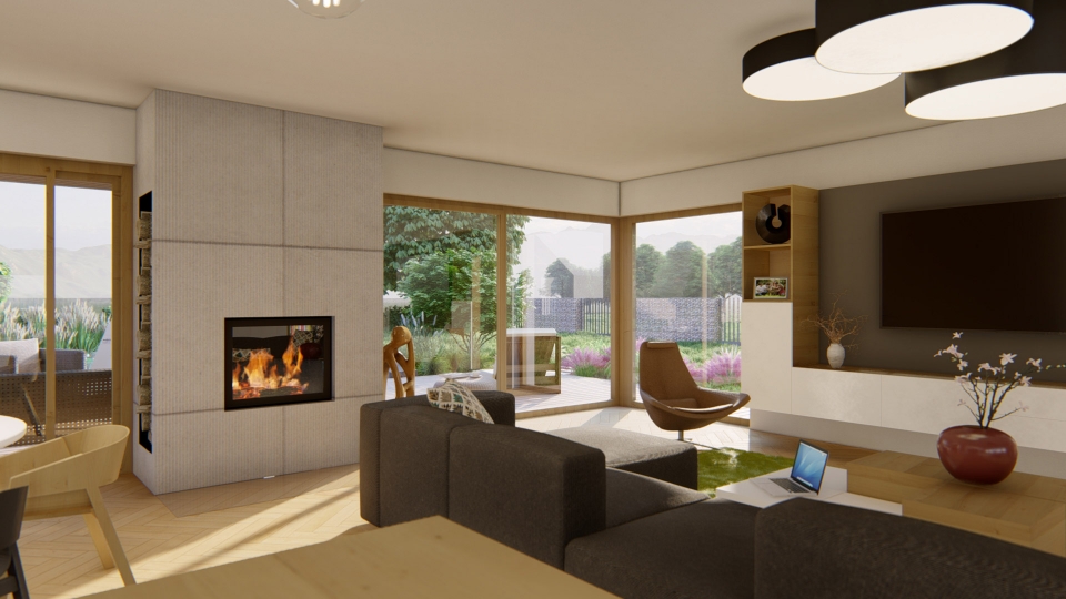 Interiér domu je navržen s důrazem na otevřenost a světelnost, kde velká okna přinášejí dostatek denního světla a umožňují nerušený výhled na jezírko a zahradu. Použité materiály a barevné ladění vytváří teplou a přívětivou atmosféru, která podporuje komfort a pohodu obyvatel.