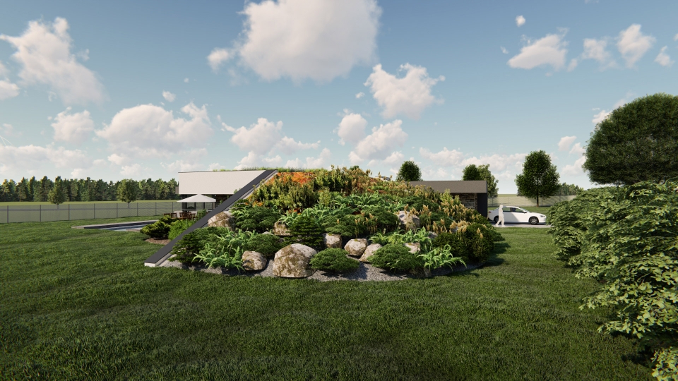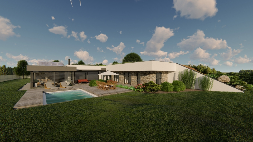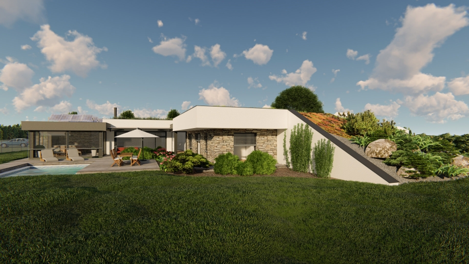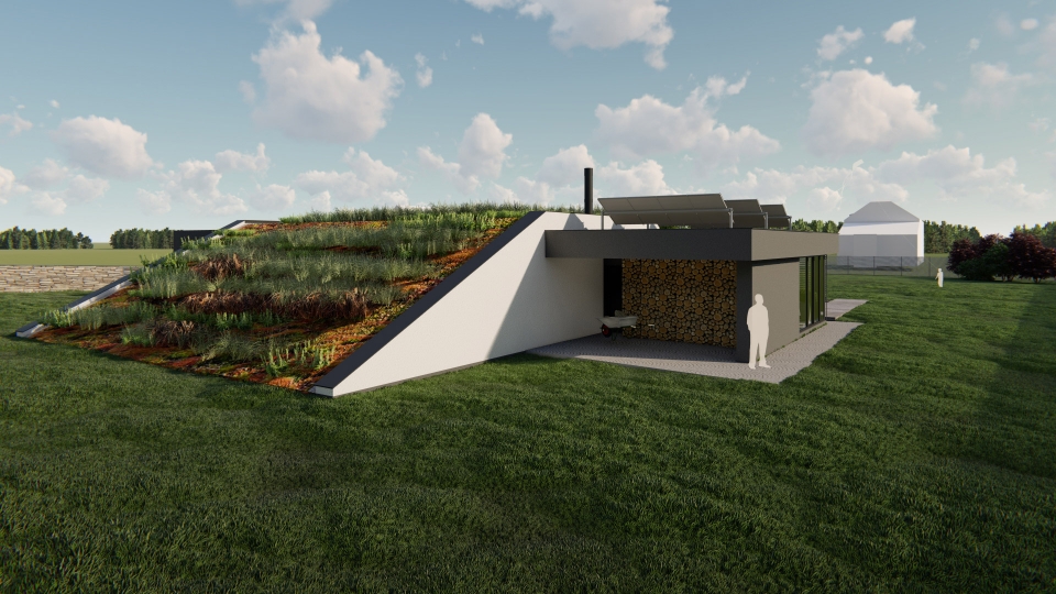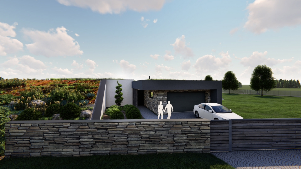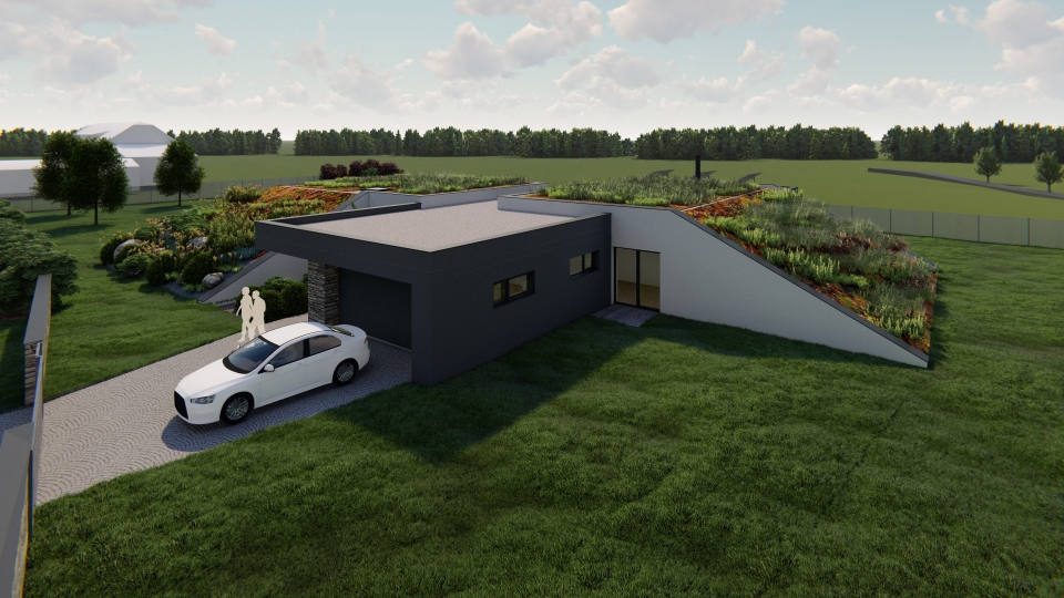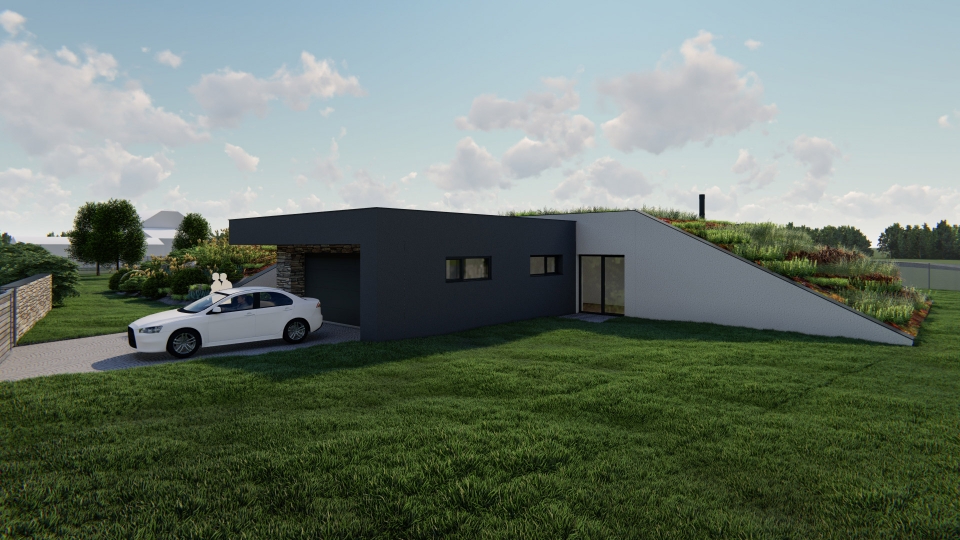 Netradičně navržený jednopodlažní rodinný dům o dispozici 5+kk připomínající bunkr, tím, že je ze dvou stran přisypán zeminou. Uprostřed domu se nachází obytný prostor o velikosti 60 m2, vedle něho se nachází ložnice se šatnou a koupelnou, v další části se nachází dětské pokoje a pracovna (pokoj pro hosty) s koupelnou. K domu patří garáž a zimní zahrada.