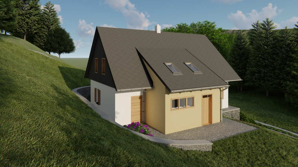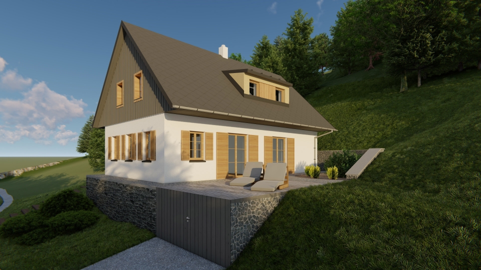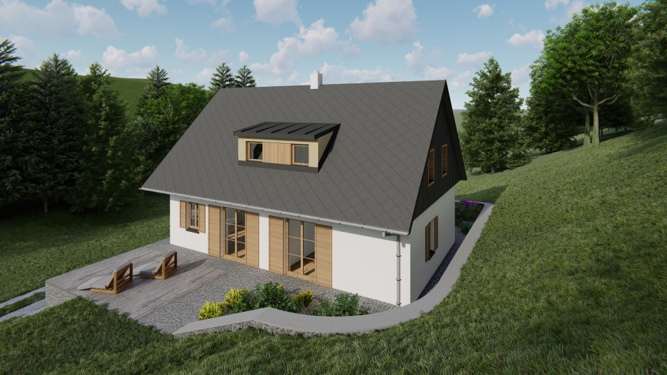 Velká okna propojují interiér s venkovním prostředím a přinášejí dostatek přirozeného světla, čímž vytvářejí světlý a vzdušný obytný prostor. Celkový design kombinuje tradiční prvky s moderní estetikou, což zajišťuje útulnost i praktičnost ve všech ročních obdobích.