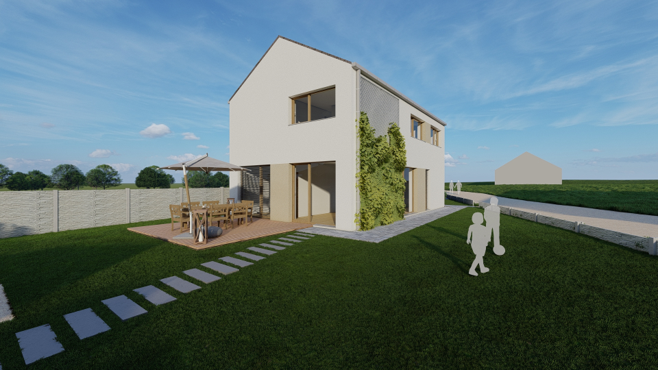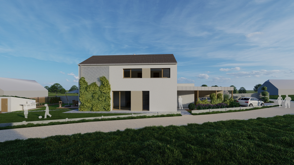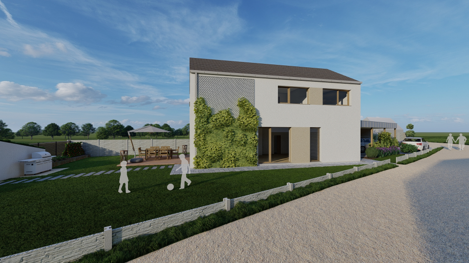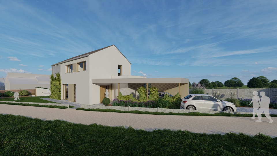 Projekt rodinného domu o dispozici 5+kk. Dům je umístěn na velmi malý nepravidelný pozemek.
