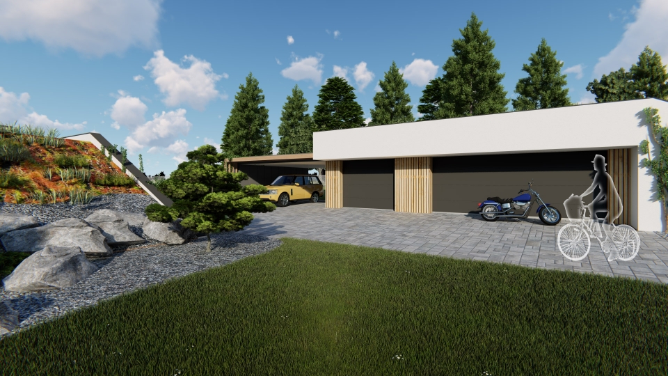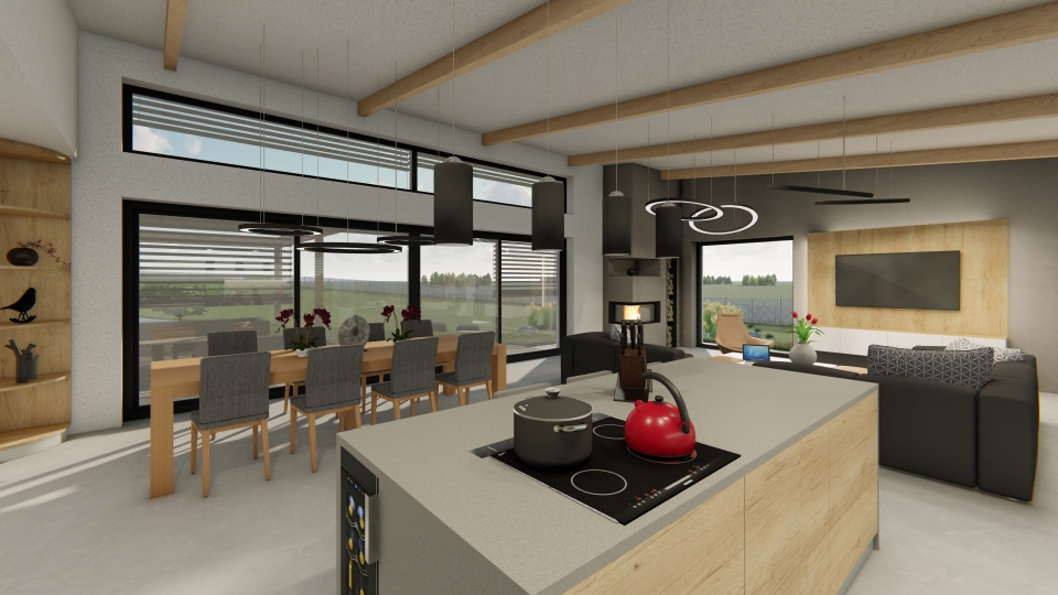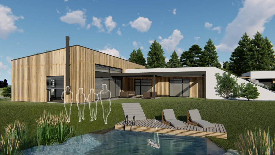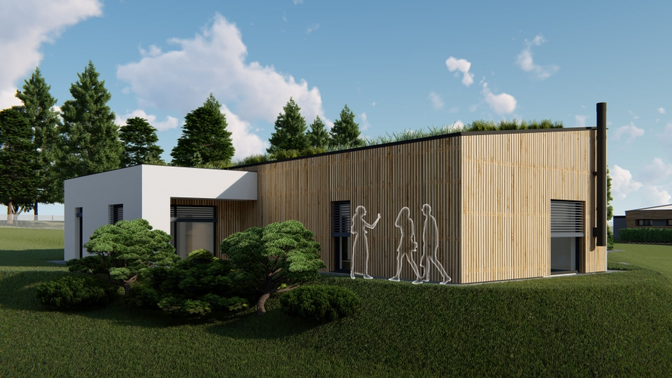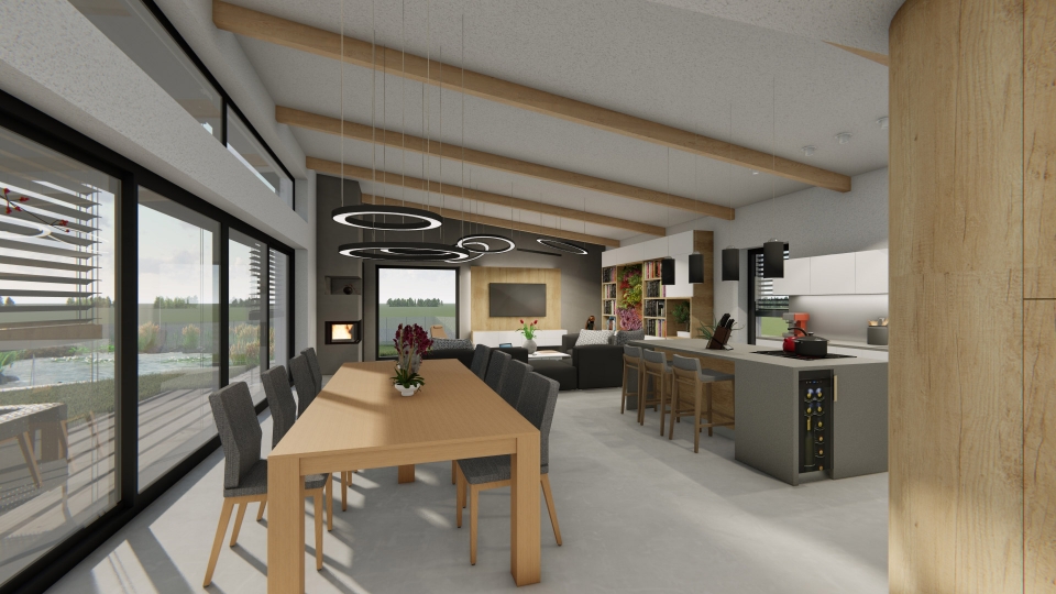 Tento dům je moderní a funkční stavba sladěná s přírodou okolí. Architektura se vyznačuje jednoduchými a elegantními tvary s důrazem na přírodní materiály a propojení interiéru s venkovním prostředím pomocí velkých prosklených ploch. Interiér je navržen jako světelný a prostorný prostor s otevřeným uspořádáním, kde dominují přírodní materiály a neutrální barvy, které vytvářejí útulnou a příjemnou atmosféru pro každodenní rodinný život. Velká okna přinášejí do interiéru dostatek denního světla a umožňují nerušený pohled do zahrady a okolní krajiny.