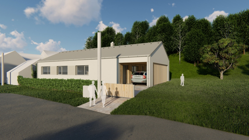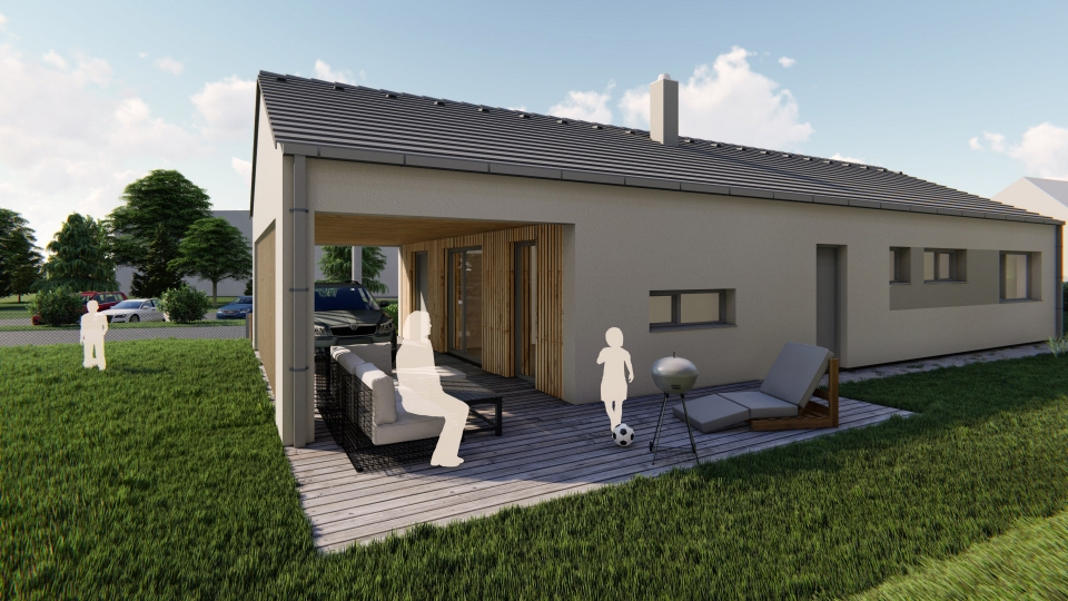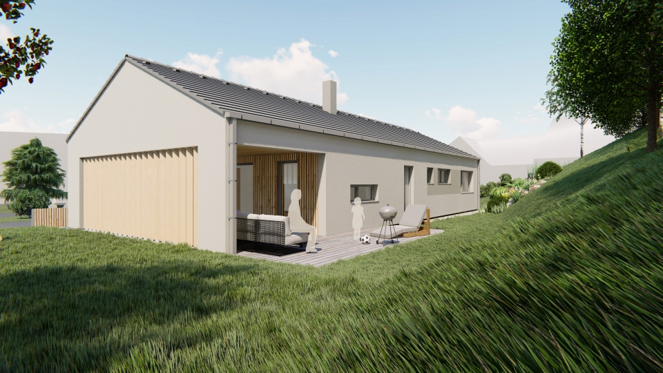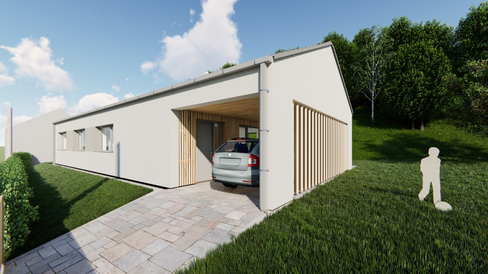 Tento rodinný dům u silnice vznikl na malém komplikovaném pozemku, který je z obou stran omezen svahem. Dům je přízemní o dispozici 4+kk s krytým stáním a krytou terasou v zadní části.