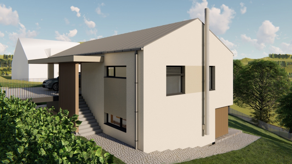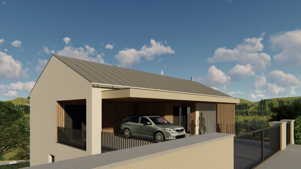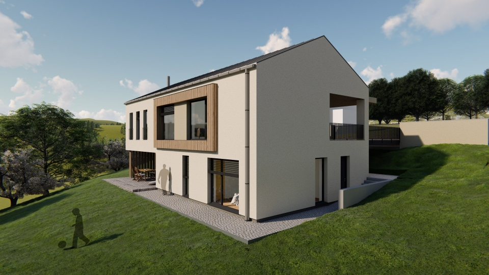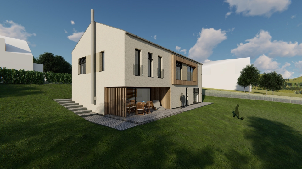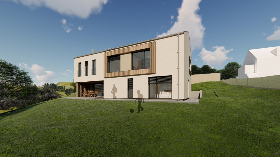 Dvoupatrový dům o dispozici 5+kk ve svahu s krásným výhledem na okolí. V přízemí domu se nachází obytný prostor o velikosti 54 m2spojený se schodištěm, ložnice se šatnou a koupelnou atechnické zázemí domu. V prvním patře se nachází vstup do domu, kryté parkovací stání s dílnou, dva dětské pokoje, pracovna (pokoj pro hosty) a koupelna. Dům je k cestě připojen pomocí mostu.